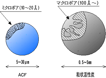 活性炭素繊維ACFと粒状活性炭の細孔構造 |