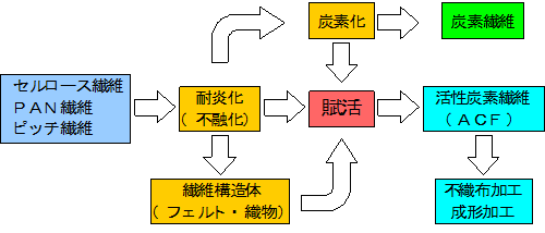 ACFの製造方法は、原料の種類により条件およびプロセスが多少異なりますが、基本的には衣料用繊維と同じです。紡糸した繊維を加熱処理などにより酸化、不溶融化した後、賦活工程にて活性化して、繊維内部の微細孔を開孔させます。 |