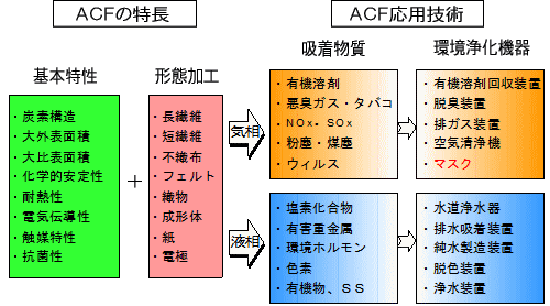 ※気相では、ACFは新型ウィルスなど病原菌吸着と抗菌性があるため、マスクに組み込むことによりウィルスの体内侵入を防ぎ、感染症予防に効果があります。微細な埃や粉塵などの吸着効果もあるため、花粉対策や粉塵作業現場、災害現場などの作業用としても効果的です。 |