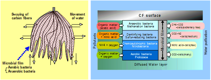 Water quality purification using CarbonFiber is economical and effective method. And it is low environmental impact. Active biofilm are formed by high bioaffinity of CarbonFiber, and its microorganisms decompose contaminants. On the other hand, biosonic radiates from CarbonFiber activate microorganisms and gather fishes.CarbonFiber exercises seaweed bed function.