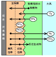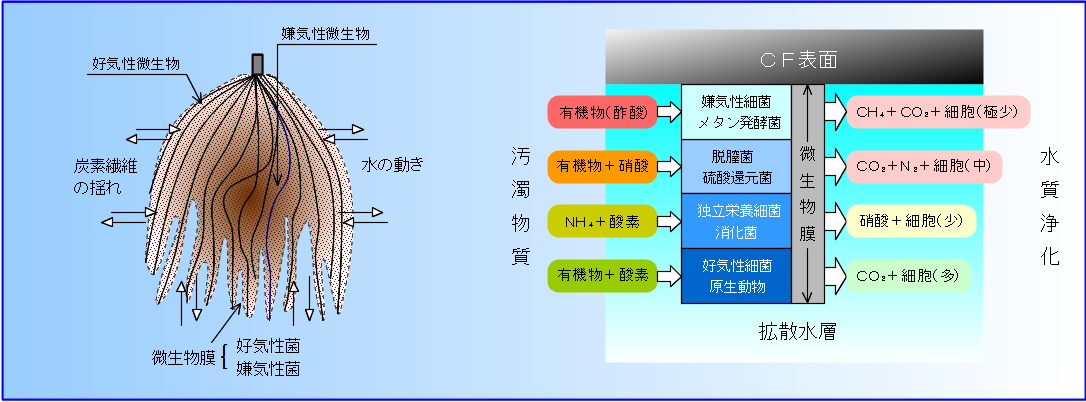 | 炭素繊維の揺れによる水の動きと汚濁物質分解 | 微生物膜内の微生物の主な栄養(汚濁)物質と代謝成物 |