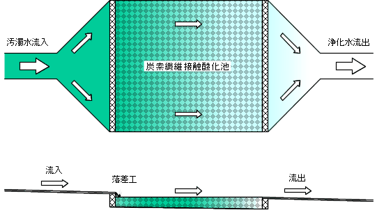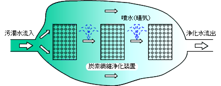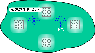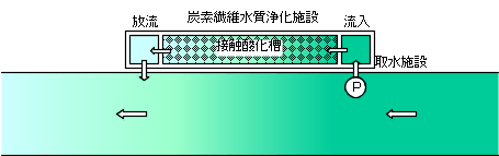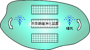 | 分離方式は、水域より一定の水量を分離して水域外に設けた浄化槽内に炭素繊維水質浄化装置を設置します。汚濁水が浄化槽内にて炭素繊維生物膜に接触することにより水質浄化を図ります。浄化槽内は、流入水量の制御が可能であり土砂やゴミの流入を抑えられることから、安定した水質浄化が可能です。必要に応じて取水施設や導水管、流入施設、流出施設、放流施設を設けます。 |