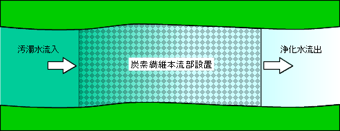 河川本流部に設置する本流部設置方式と、河川内を仕切り炭素繊維接触池を設けて設置する接触池設置方式とがあります。 |