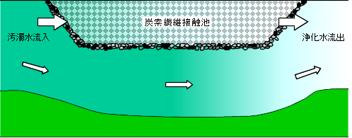 | 流入水浄化方式は、河川あるいは湖沼に流入する小川や排水路、湿原よりの流入水などを浄化するために浄化池などを設けて炭素繊維浄化装置を設置します。汚濁水が浄化池にて炭素繊維生物膜に接触することにより水質浄化を図ります。